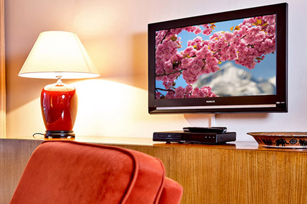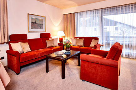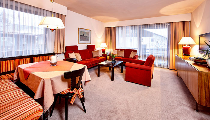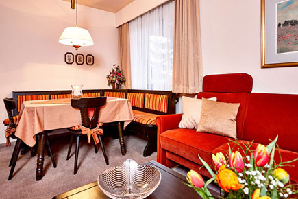 Gemütliches Wohnzimmer mit Couchgarnitur, Essplatz, SAT-Flachbild-TV, Radio, Telefon und Zugang zum Südbalkon.